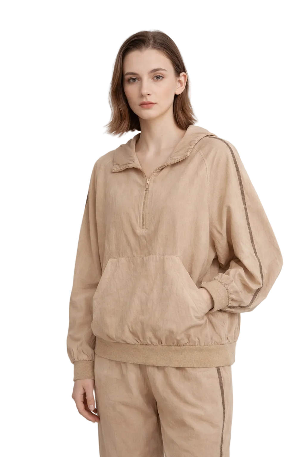 Dieses Damen-Set besteht aus einer leichten Kapuzenjacke und einer passenden Hose und wurde aus einem dünnen, glatten Stoff mit dezentem Glanz gefertigt. Die Kapuzenjacke hat eine entspannte, bequeme Passform mit langen Ärmeln, einer integrierten Kapuze und einem durchgehenden Reißverschluss auf der Vorderseite. Die Hose ist im gleichen Stil und in derselben Farbe gehalten, wodurch ein harmonisches und stimmiges Gesamtbild entsteht. Das Set eignet sich besonders für mildere Jahreszeiten und bietet eine komfortable Lösung für den Alltag.